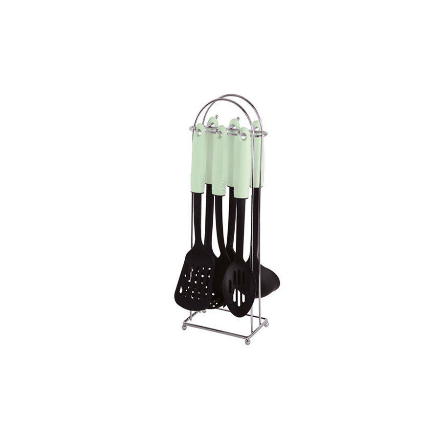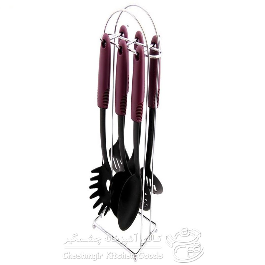 شامل یک عدد قاشق ساده، یک عدد ملاقه ساده، یک عدد قاشق شیاردار، یک عدد کفگیر برگردان بزرگ شیاردار، یک عدد کفگیر شیاردار، یک عدد قاشق سرو و یک عدد پایه نگه دارنده از جنس استیل می باشد که با داشتن طراحی زیبا و منحصربه فرد، علاوه بر کاربردی بودن، میتواند زینت بخش فضای آشپزخانه تان باشد. پایه محکم و ضد لغزش این سرویس به شما امکان میدهد که به راحتی آن را روی میز و کابینت قرار دهید.