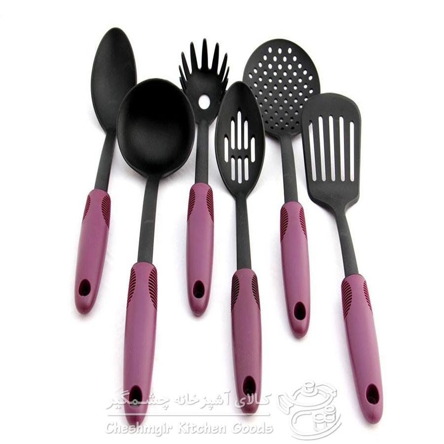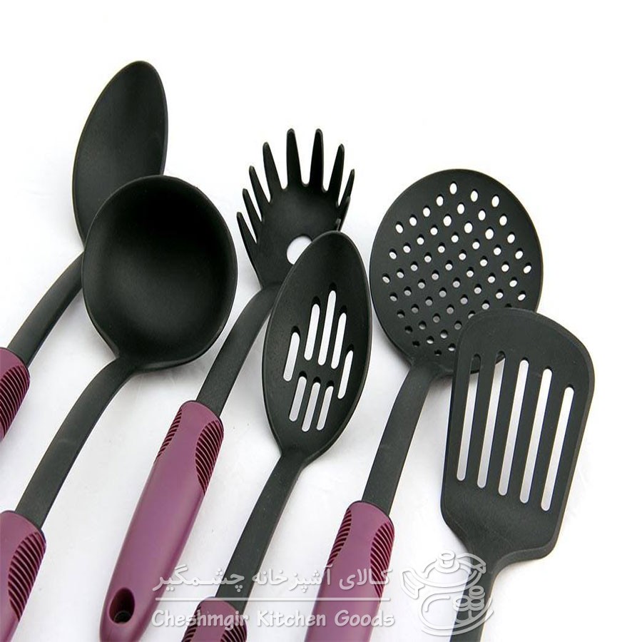 ست 7 پارچه کفگیر و ملاقهبه رنگ های زیبای بادمجانی و سبز روشن طراحی شده اند. هر آشپزخانه ای نیازمند ابزار با کیفیت مثل یک کفگیر ملاقه سبک و کاربردی می باشد.در آشپزی و پخت و پز نیاز به کفگیر و ملاقه های بلندی است که گرما از دسته عبور نکند. این سرویس از جنس پلاستیک است و ظرفیت دمایی بسیار بالایی دارد. بنابر این حتی اگر داخل قابلمه هم جا بماند شما شاهد گرمای این دسته نخواهید بود.